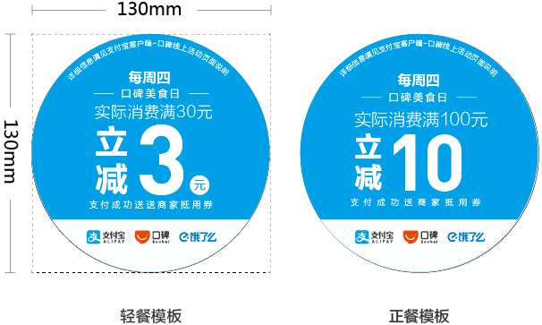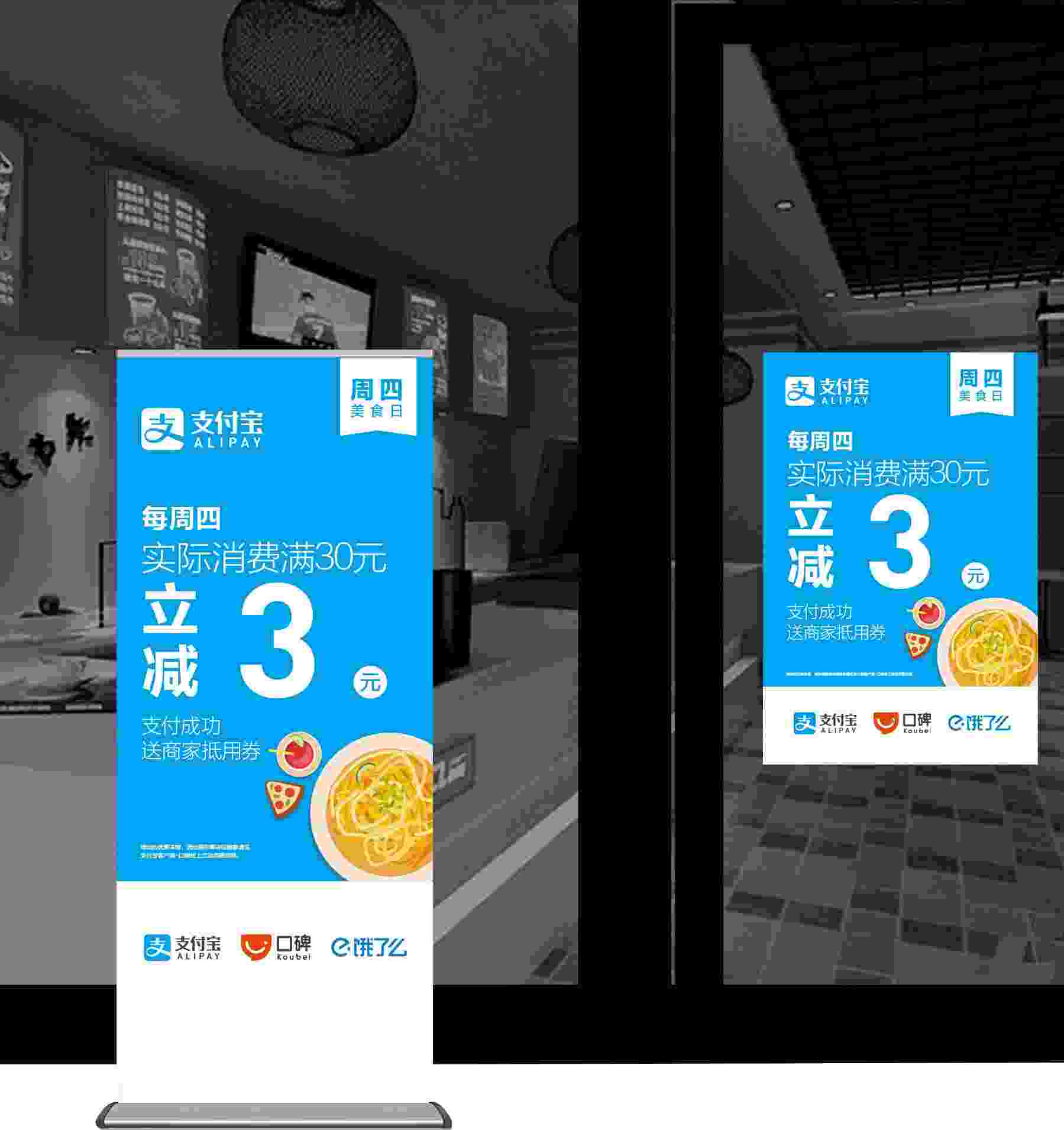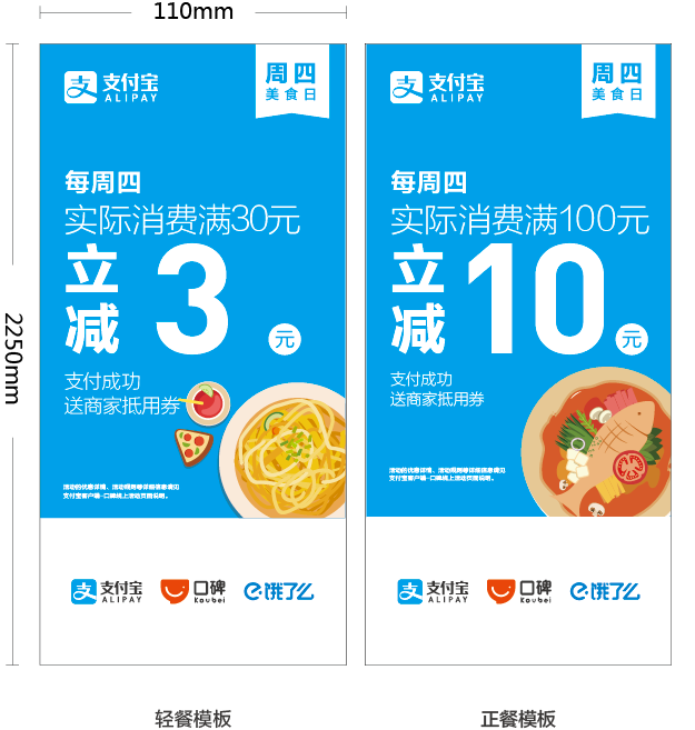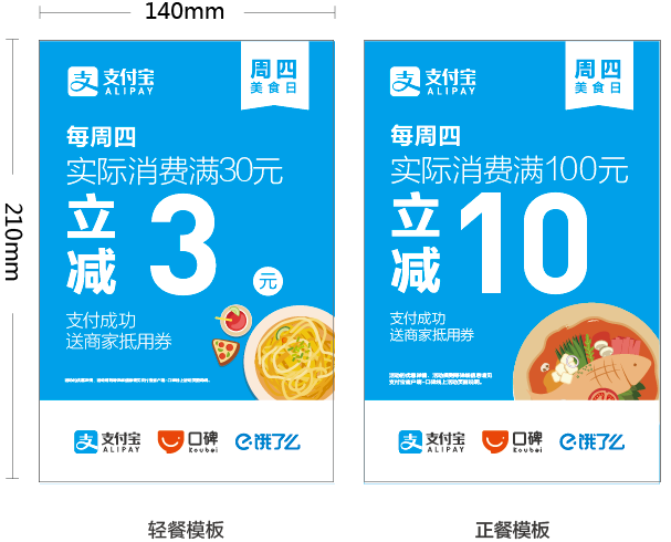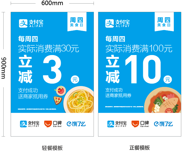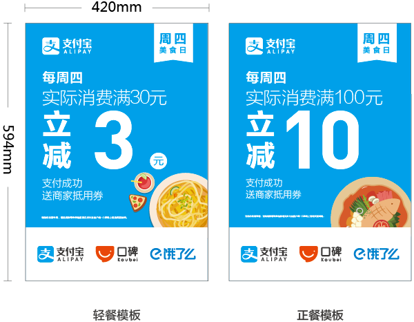 该模板为餐饮周四美食日活动专用,城市可根据物料模板修改活动利益点,需确保主KV不变,且保证支付宝口碑的品牌露出。