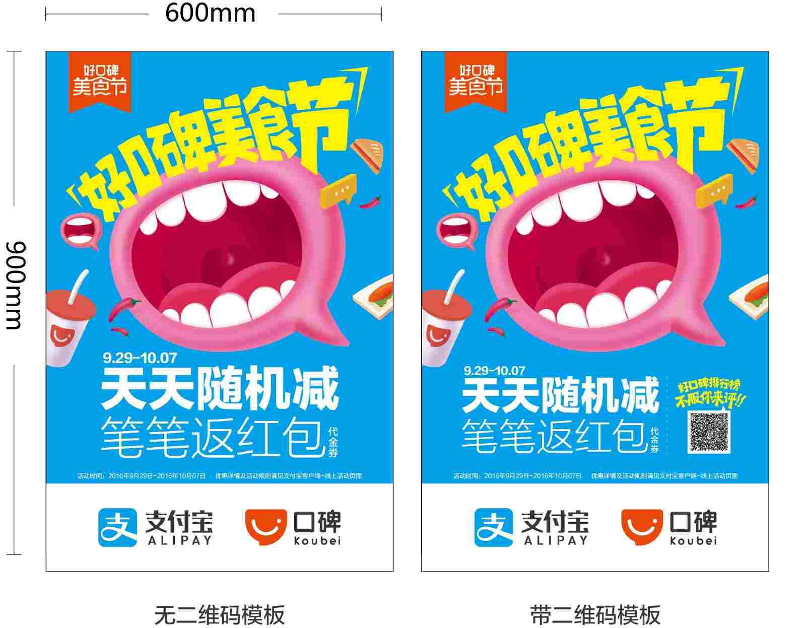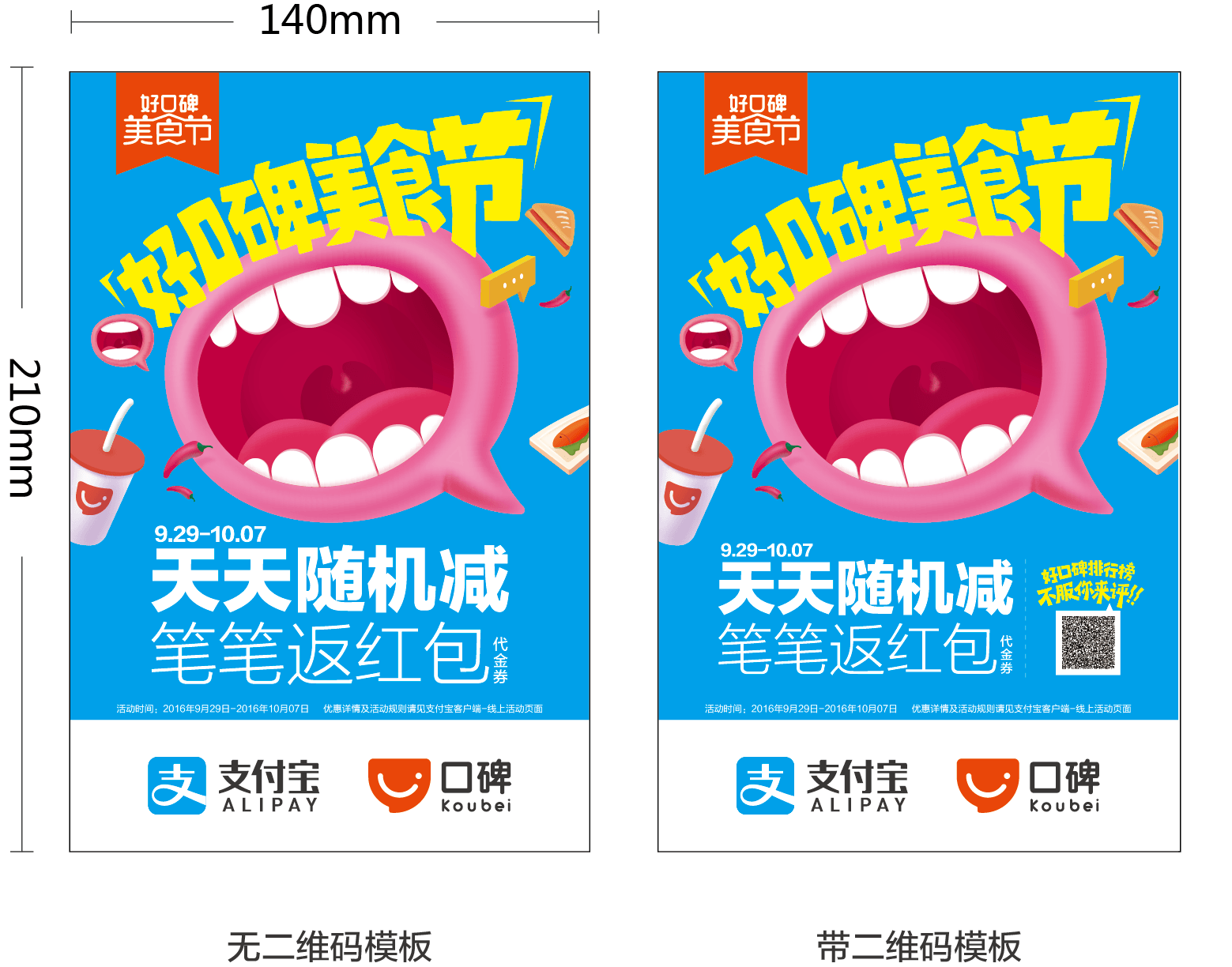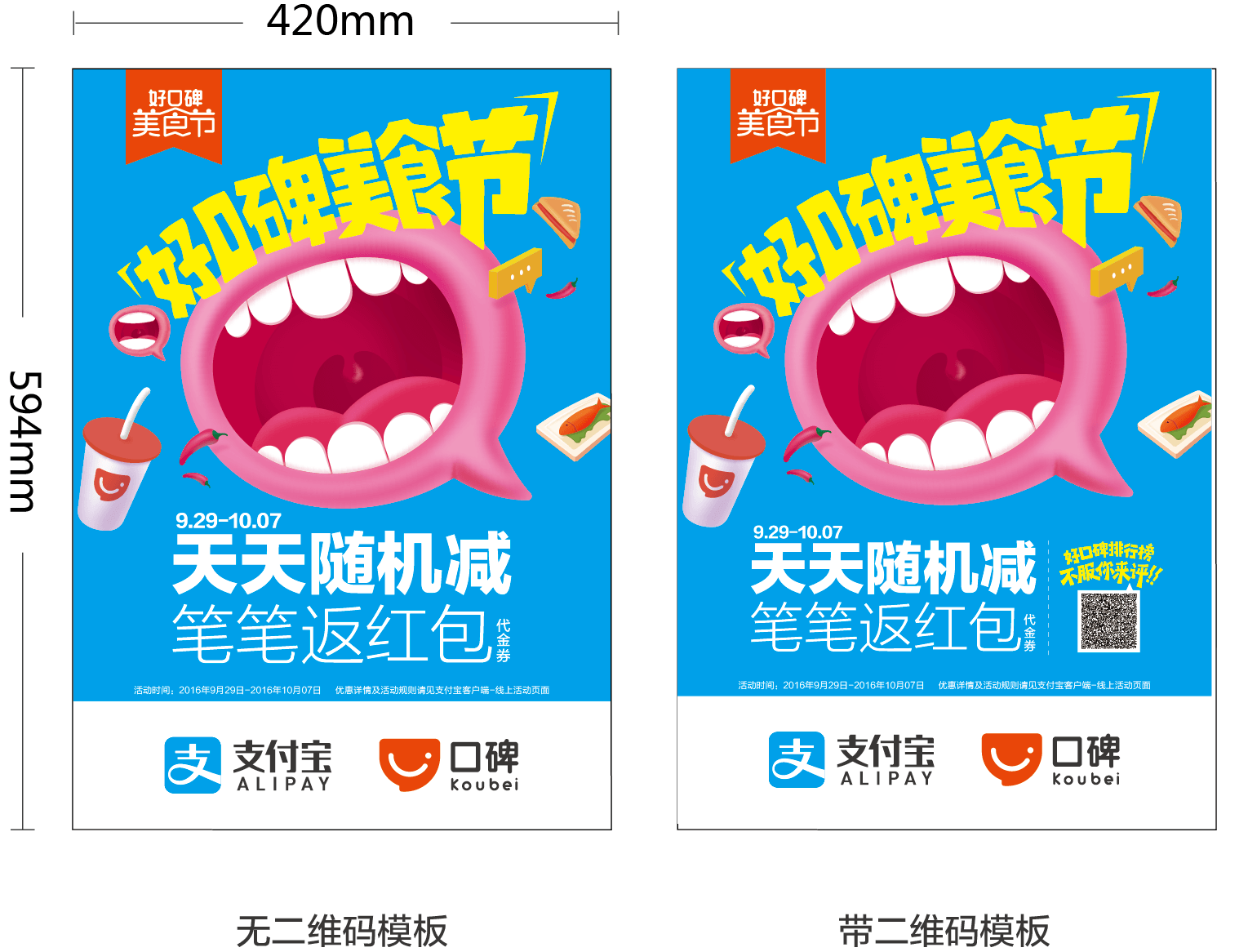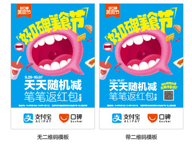 “口碑9月大促活动物料”有2套文件压缩包,分别为:无二维码模板和带二维码模板(二维码为同期的线上页面的链接二维码),在每一套模板下,又分为不带商家logo与带商家logo模板,同时提供6种常规尺寸。以下是本次活动的主kv:
