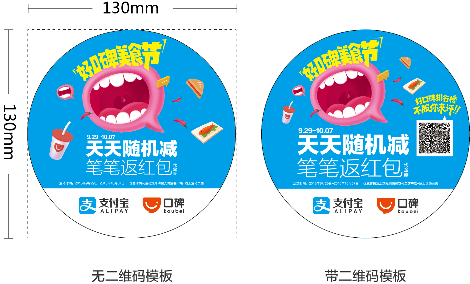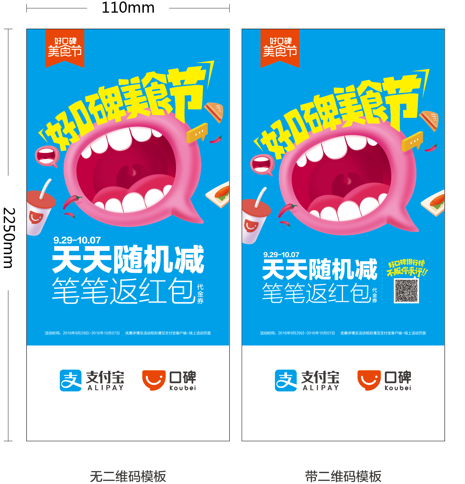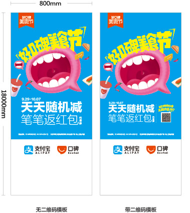 “口碑9月大促活动物料”有2套文件压缩包,分别为:无二维码模板和带二维码模板(二维码为同期的线上页面的链接二维码),在每一套模板下,又分为不带商家logo与带商家logo模板,同时提供6种常规尺寸。以下是本次活动的主kv:
